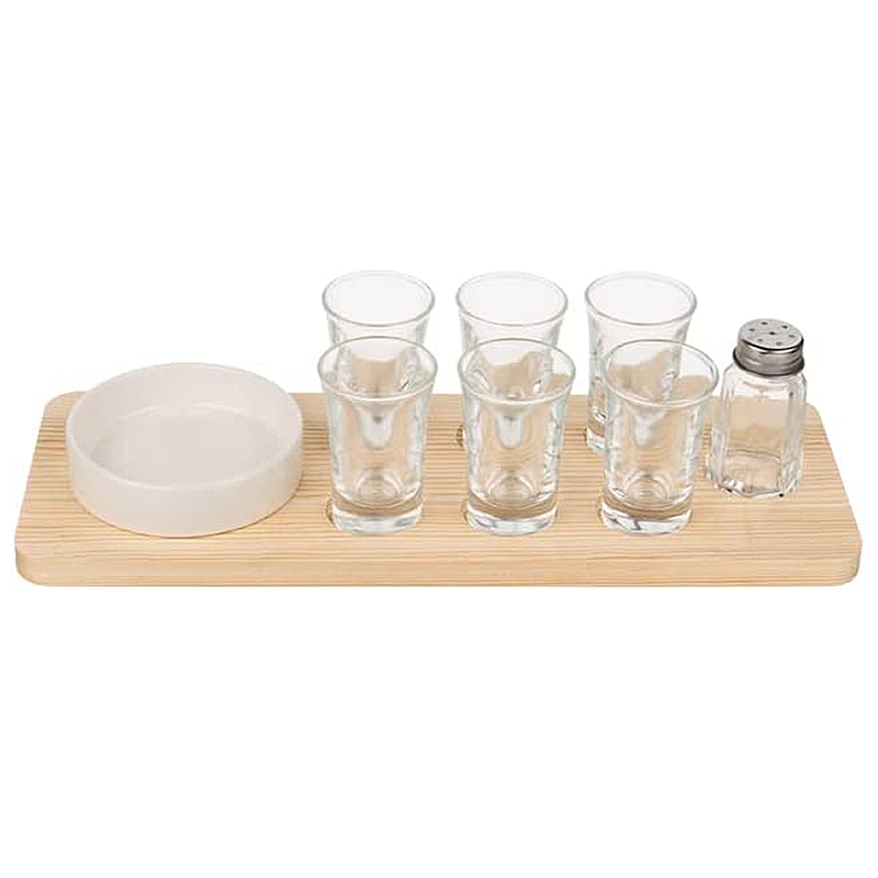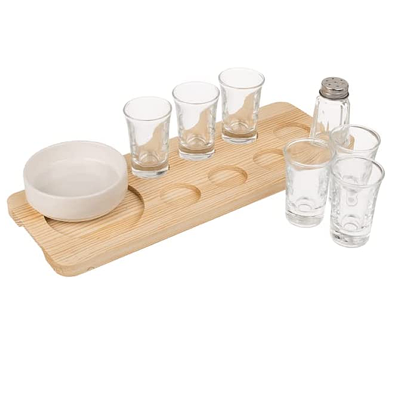 Set includes: 6 shot glasses. Salt shaker. Stoneware bowl. Wooden serving tray.