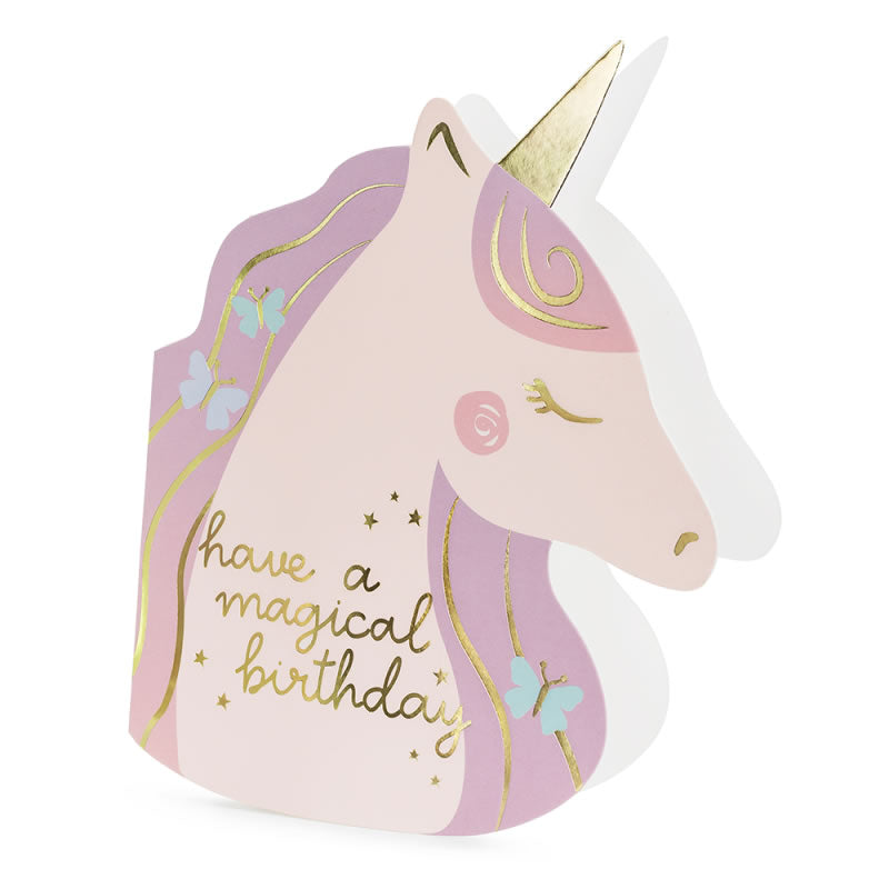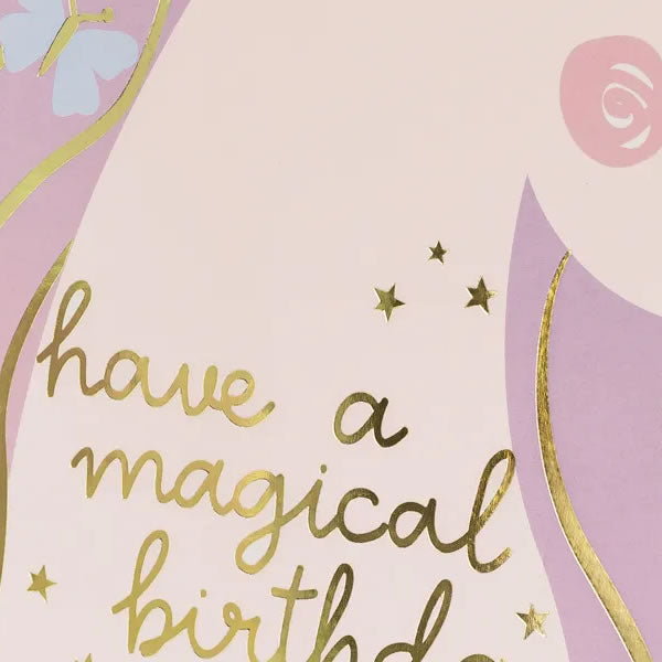 This birthday card features a charming unicorn design in a lovely mix of pastel colours and gold foil detailing, perfect for adding a touch of magic to someone's special day. Measuring approximately 15 x 18.5 centimetres, this card offers ample space for a heartfelt message. The card includes lovely pink envelope with agold foil bow. Whether for a child's birthday or an adult's celebration, this unicorn card is suitable for many occasions.