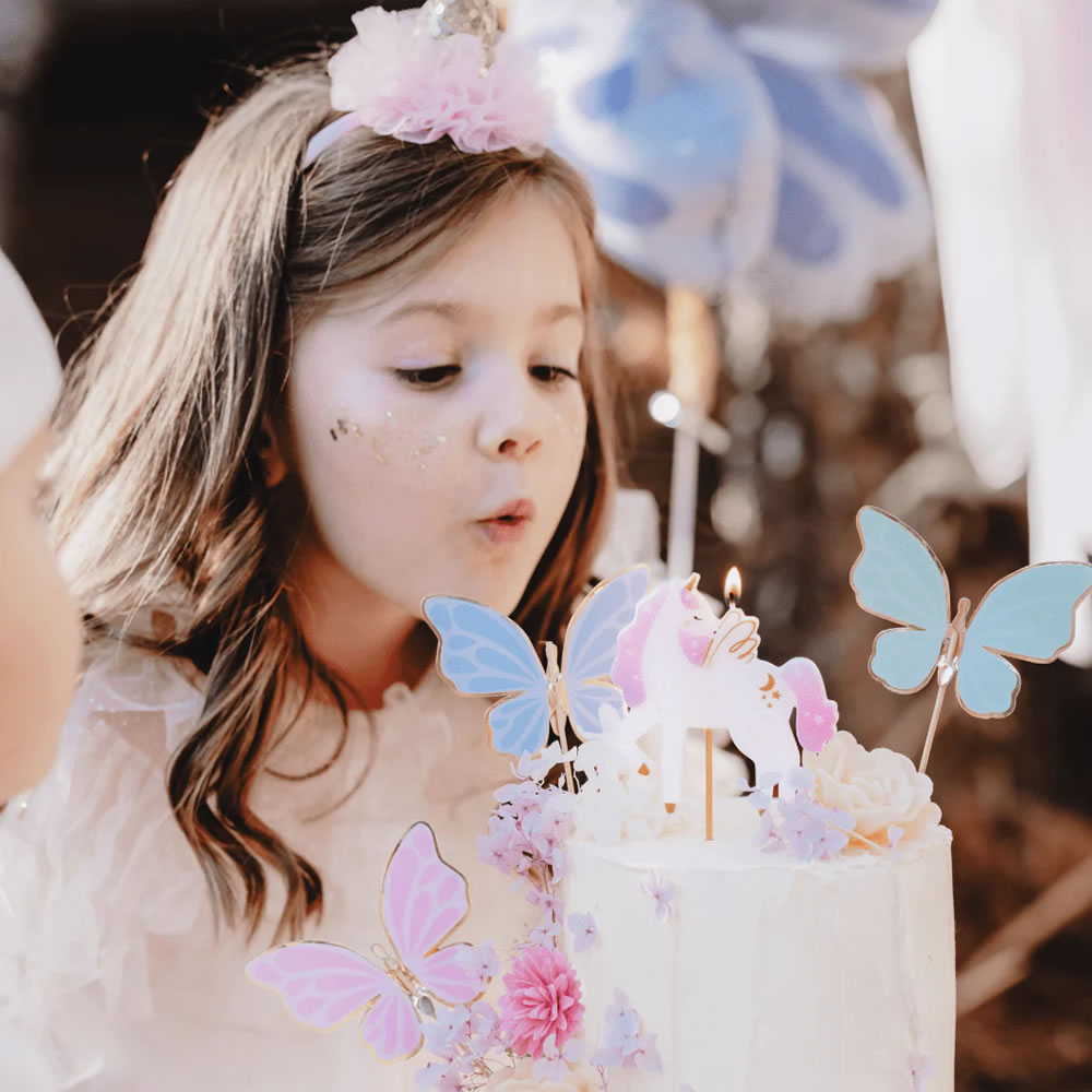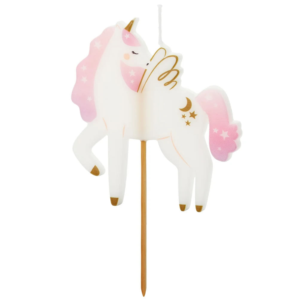 A bold 9cm unicorn candle that demands attention on any cake. White body with pink mane and tail, golden horn, and celestial decorations. The wooden pick base makes it easy to insert into cakes and desserts. Perfect for magical parties that refuse to be ordinary.