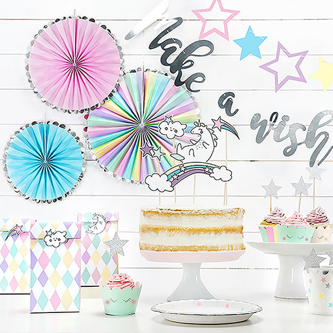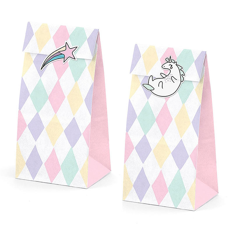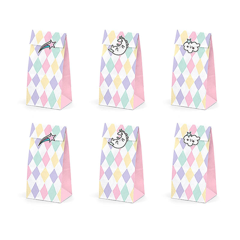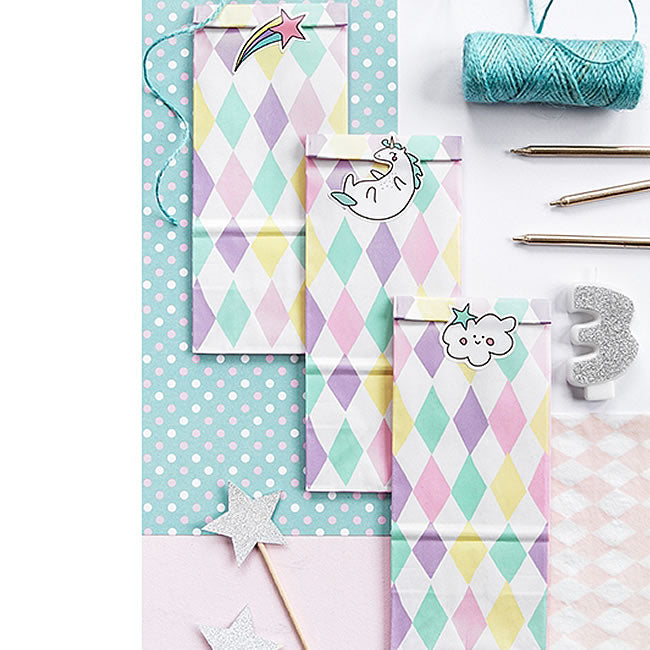 These unicorn star party treat bags are perfect for any unicorn-themed celebration. The paper bags feature colourful pastel print with 6 sealing stickers.