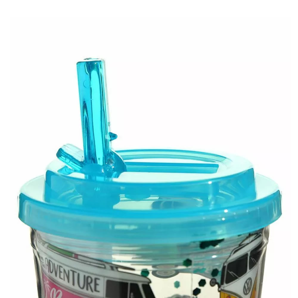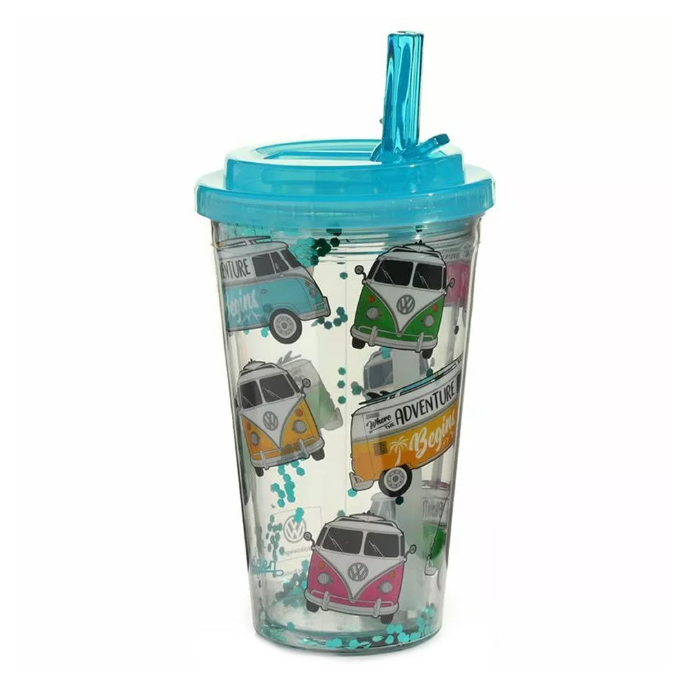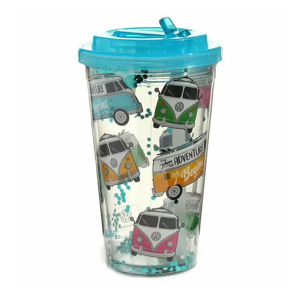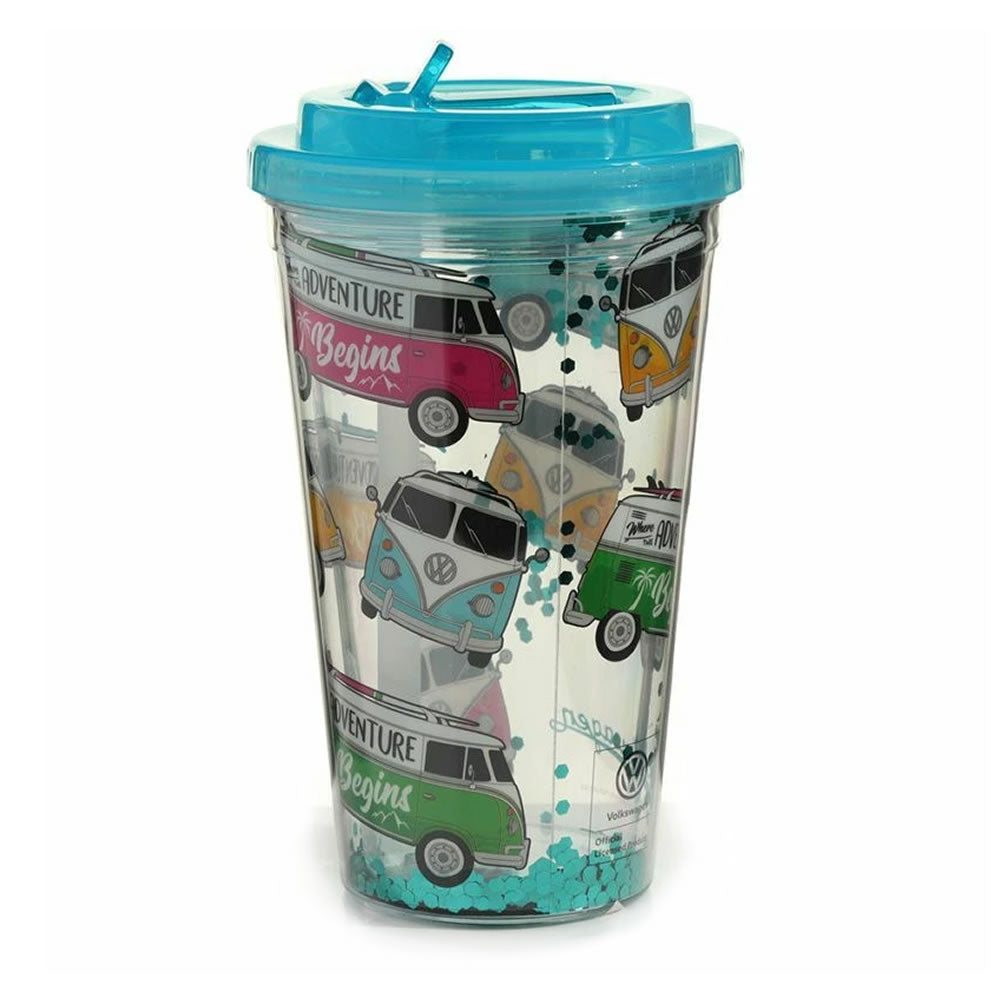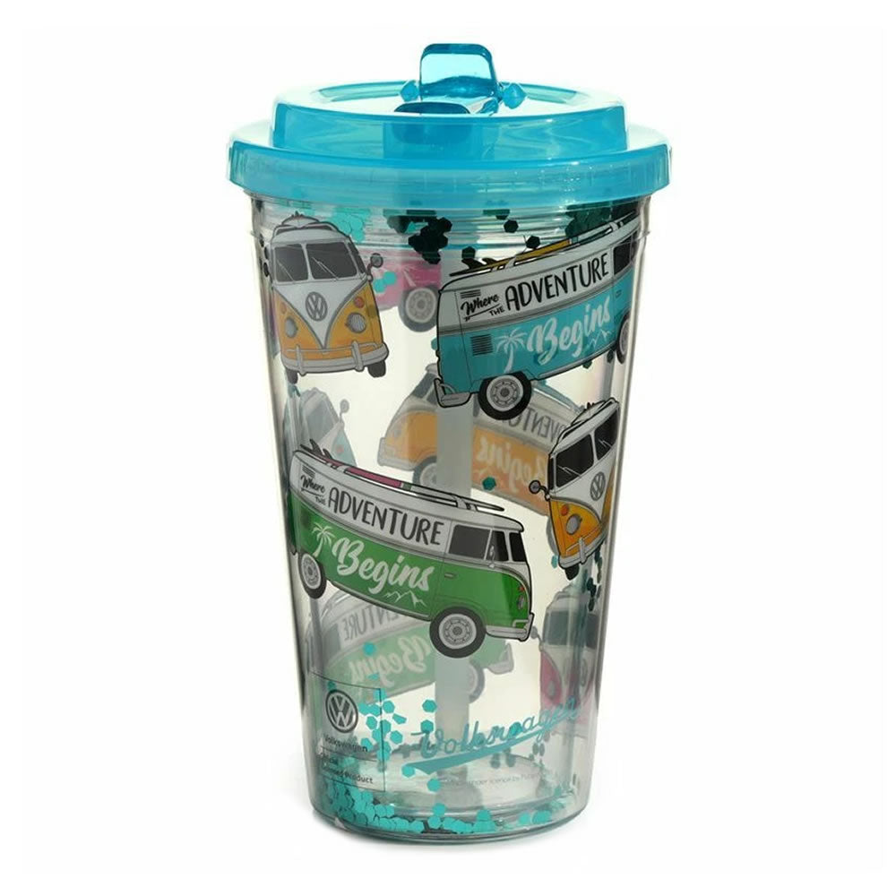Take on the road with style in this VW T1 Camper Bus Double Walled Cup with Straw and Lid. Featuring a retro design of classic VW Camper Buses. Durable and practical, the 16 cm high and 10 cm wide cup comes with a turquoise lid and built-in straw for easy sipping and prevents spills. Perfect for both hot and cold drinks, this cup is a must-have for your daily adventures.